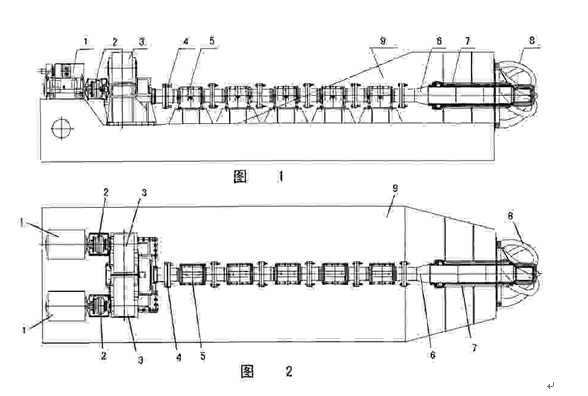 該雙電機(jī)驅(qū)動絞刀傳動系統(tǒng)包含變頻電機(jī)1、高彈性摩擦離合器2、齒輪箱3、中間傳動軸4、中間支撐裝置5、絞刀軸6、絞刀支承軸承7和絞刀8。兩臺變頻電機(jī)1、兩個高彈性摩擦離合器2、兩個齒輪箱3分成兩組,均由橋架支承;每一組包括一臺變頻電機(jī)1、一個高彈性摩擦離合器2和一個齒輪箱3;高彈性摩擦離合器將變頻電機(jī)1和齒輪箱3連接起來,變頻電機(jī)1通過高彈性摩擦離合器2將功率和轉(zhuǎn)速傳送到齒輪箱3上。高彈性摩擦離合器2起到柔性連接作用。并通過離合器內(nèi)部橡膠件調(diào)節(jié)系統(tǒng)剛度,##系統(tǒng)具有良好扭振性能。兩齒輪箱3成雙機(jī)并車結(jié)構(gòu)共同驅(qū)動中間傳動軸4。齒輪箱3有可承受雙向推力的軸承,絞刀工作時產(chǎn)生的軸向推力通過中間傳動軸4傳遞到齒輪箱3的軸承上,##綜通過齒輪箱地腳鉸制螺栓傳遞到橋架9上。在兩臺變頻電機(jī)1同時工作時,可以對兩臺變頻電機(jī)1同時進(jìn)行控制,從而能滿足兩臺變頻電機(jī)1均勻負(fù)載。齒輪箱3與中間傳動軸4聯(lián)接。中間傳動軸4與絞刀軸6聯(lián)接。每一中間傳動軸4均由一中間支承裝置5來支承。中間支承裝置5包括高分子復(fù)合材料軸承,中間傳動軸4可轉(zhuǎn)動地穿過高分子復(fù)合材料軸承。高分子復(fù)合材料軸承使用海水海水潤滑和冷卻,具有彈性好、耐磨性好的特點。中間支承裝置5通過地腳鉸制螺栓緊固在橋架9上,可以有效地起到支撐中間傳動軸4自身重量以及運轉(zhuǎn)產(chǎn)生的徑向力作用。絞刀支承軸承7是高分子復(fù)合材料軸承,對橋架9振動具有良好的減震和吸震作用,同時對于橋架9的不規(guī)則變形具有良好的位移補(bǔ)償能力。