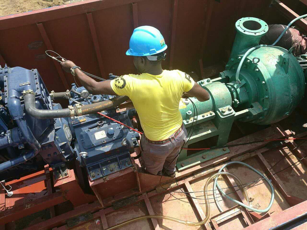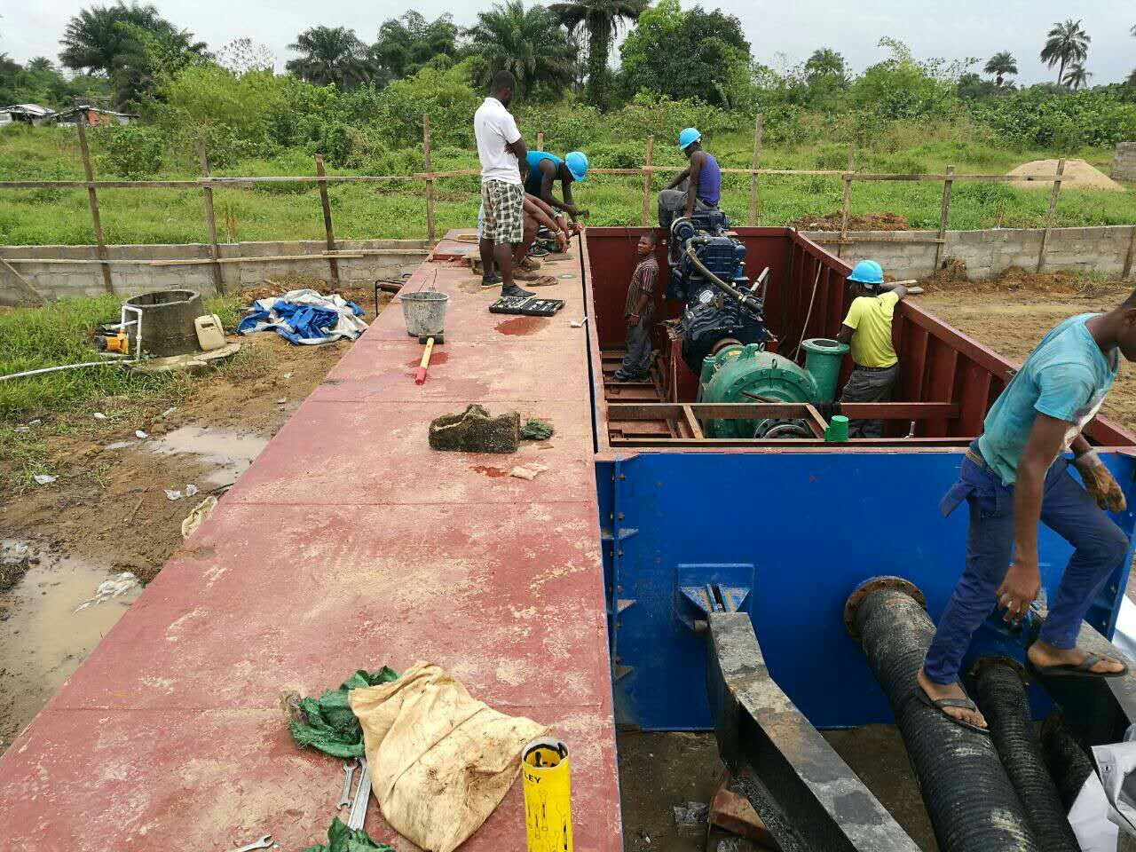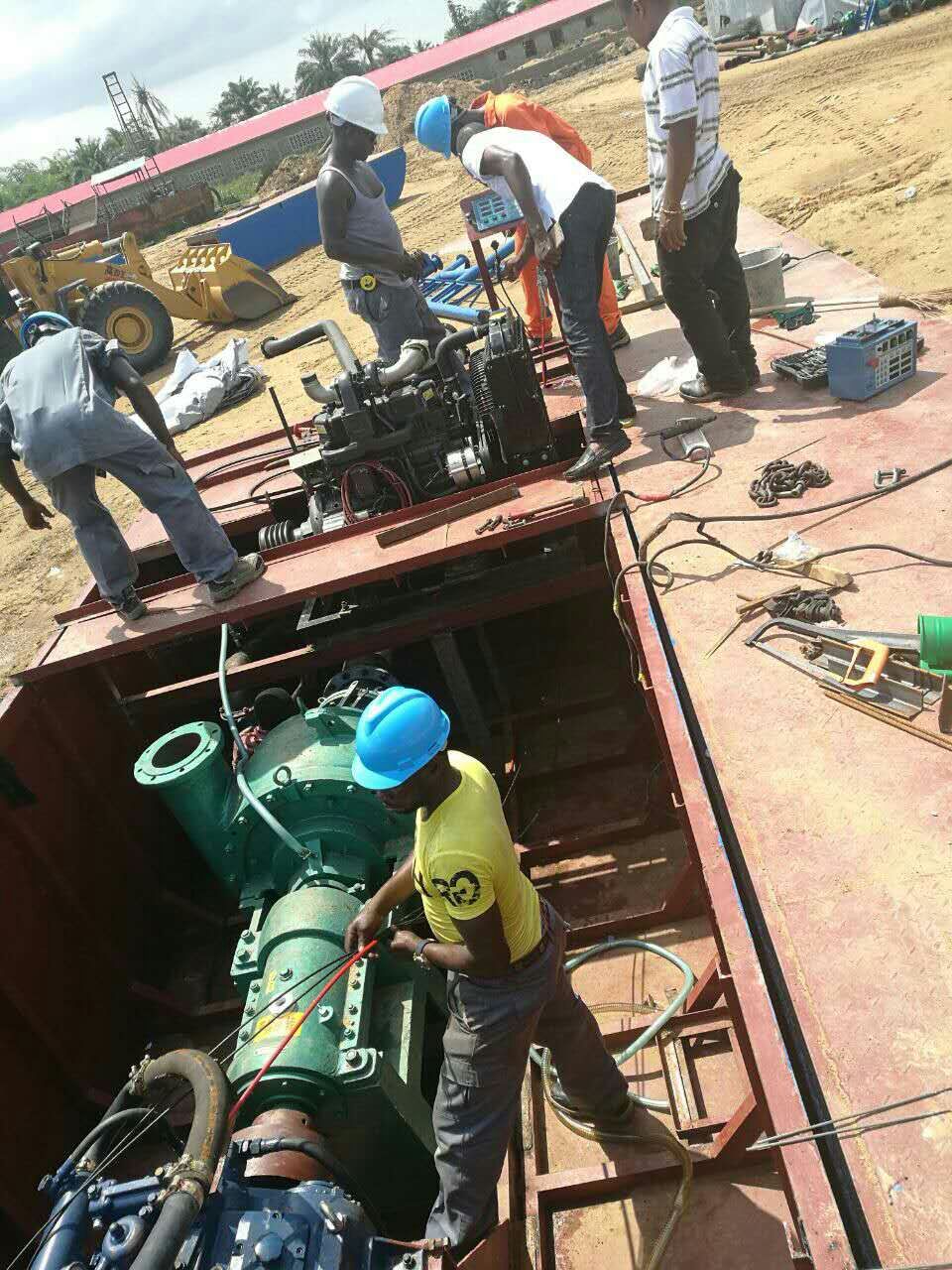 發(fā)往西部非洲##利比里亞的射吸式抽沙船正在緊張安裝中。本設(shè)備抽沙深度為15米,每小時可抽沙150立方米,排出距離250-300米,適合于水面面積比較大的河道、湖泊、水庫等場地的抽沙、清淤工作。